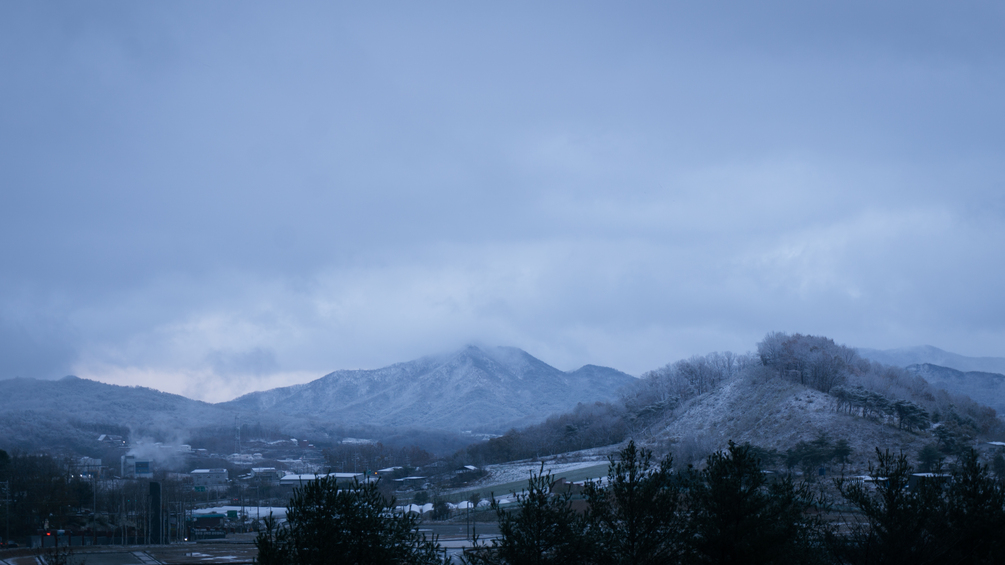 설명 : 첫눈이 온 날, 폭설로 뒤덮인 산을 촬영했습니다. 휘몰아치는 눈보라로 푸르러진 하늘과 새하얀 산이 조화롭게 보여 카메라를 들지 않을 수 없었습니다.